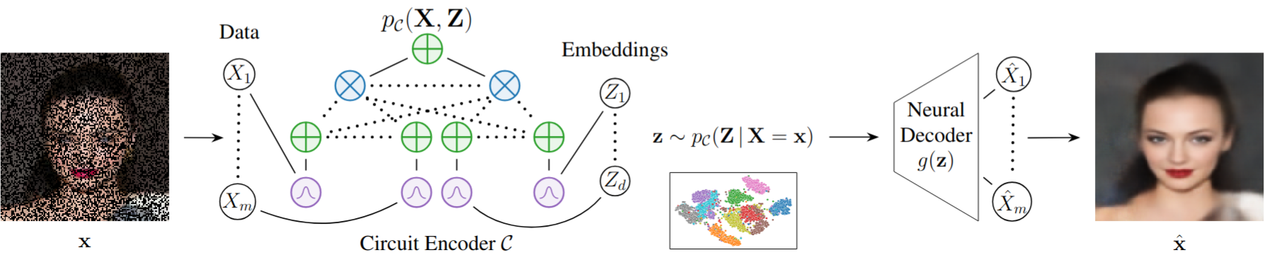 Probabilistic Circuits (PCs) enable exact tractable inference, yet their application to representation learning remains underexplored. We introduce Autoencoding Probabilistic Circuits (APCs), a novel framework leveraging PC tractability to explicitly model probabilistic embeddings. APCs jointly model data and latent representations, obtaining embeddings via probabilistic inference using a PC encoder, which is integrated with a neural decoder in an end-to-end trainable hybrid architecture enabled by differentiable sampling. Empirical evaluations demonstrate APCs outperform existing PC-based autoencoding methods in reconstruction quality, generate embeddings competitive with neural autoencoders, and exhibit superior robustness to missing data without requiring imputation. These results establish APCs as a powerful and flexible representation learning method, exploiting PC inference capabilities for robust applications including out-of-distribution detection and knowledge distillation.@inproceedings{ braun2025autoencoding, title={Autoencoding Probabilistic Circuits}, author={Steven Braun and Sahil Sidheekh and Sriraam Natarajan and Antonio Vergari and Martin Mundt and Kristian Kersting}, booktitle={Eighth Workshop on Tractable Probabilistic Modeling}, year={2025}, url={https://openreview.net/forum?id=zgxp6sNpie} }
