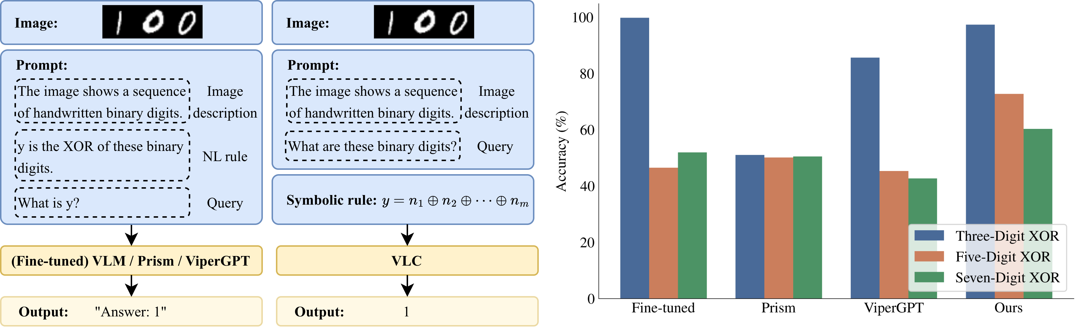 Vision-Language Models (VLMs) have been applied to a wide range of reasoning tasks, yet it remains unclear whether they can reason robustly under distribution shifts. In this paper, we study covariate shifts in which the perceptual input distribution changes while the underlying prediction rules do not. To investigate this question, we consider visual deductive reasoning tasks, where a model is required to answer a query given an image and logical rules defined over the object concepts in the image. Empirically, we find that VLMs fine-tuned through gradient-based end-to-end training can achieve high in-distribution accuracy but fail to generalize under such shifts, suggesting that fine-tuning does not reliably induce the underlying reasoning function. This motivates a neuro-symbolic perspective that decouples perception from reasoning. However, we further observe that recent neuro-symbolic approaches that rely on black-box components for reasoning can still exhibit inconsistent robustness across tasks. To address this issue, we propose VLC, a neuro-symbolic method that combines VLM-based concept recognition with circuit-based symbolic reasoning. In particular, task rules are compiled into a symbolic program, specifically a circuit, which executes the rules exactly over the object concepts recognized by the VLM. Experiments on three visual deductive reasoning tasks with distinct rule sets show that VLC consistently achieves strong performance under covariate shifts, highlighting its ability to support robust reasoning.@misc{chen2026vlmsreasonrobustlyneurosymbolic, title={Can VLMs Reason Robustly? A Neuro-Symbolic Investigation}, author={Weixin Chen and Antonio Vergari and Han Zhao}, year={2026}, eprint={2603.23867}, archivePrefix={arXiv}, primaryClass={cs.LG}, url={https://arxiv.org/abs/2603.23867}, }