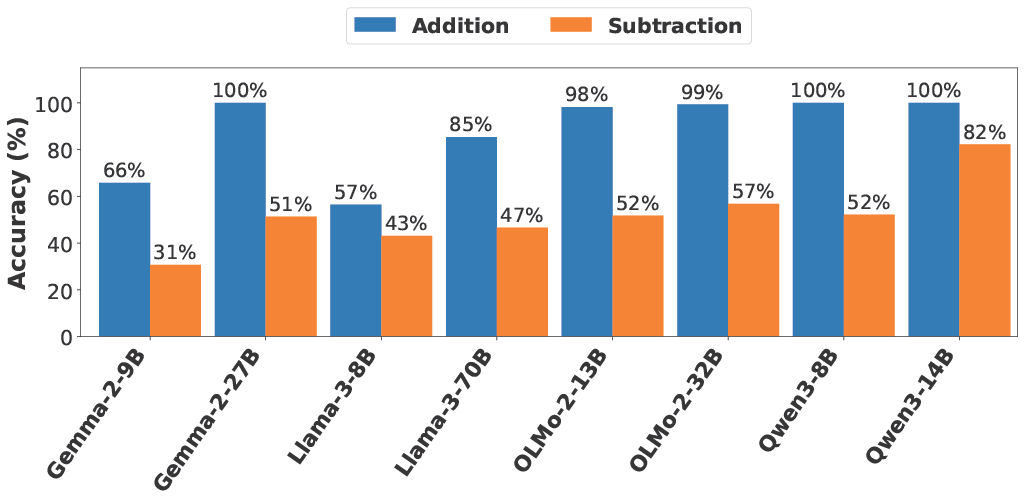 We present a systematic study of subtraction in large language models (LLMs). While prior benchmarks emphasize addition and multiplication, subtraction has received comparatively little attention despite being structurally distinct as a non-commutative operation. We evaluate eight pretrained LLMs spanning four families on addition and subtraction problems. Our experiments reveal that subtraction accuracy lags behind addition by a wide margin. We find that the errors for (a - b) are concentrated in cases where (a < b). In such cases, LLMs frequently produce the correct magnitude but omit the negative sign. Probing analyses show that LLMs internally encode whether results should be negative, yet this information is often not reflected in generated outputs. We further test well-known techniques such as few-shot learning and instruction-tuning to see if they can improve the LLMs' performance. Our results suggest that while few-shot prompting yields modest gains, the instruction-tuned models achieve near-perfect accuracies in generating the negative sign. Together, these findings provide a clearer characterization of the limitations and recoverability of LLMs' arithmetic capabilities in subtraction.@misc{jobanputra2025llmssubtractnumbers, title={Can LLMs subtract numbers?}, author={Mayank Jobanputra and Nils Philipp Walter and Maitrey Mehta and Blerta Veseli and Evan Parker Kelly Chapple and Yifan Wang and Sneha Chetani and Ellie Pavlick and Antonio Vergari and Vera Demberg}, year={2025}, eprint={2511.02795}, archivePrefix={arXiv}, primaryClass={cs.LG}, url={https://arxiv.org/abs/2511.02795}, }